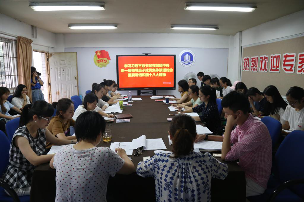 7月6日,校团委组织召开的学习习近平总书记在同团中央新一届领导班子成员集体谈话时的重要讲话和团的十八大精神专题学习会在体艺馆501会议室举行。校团委全体成员、各学院分团委书记(副书记)、学生干部代表等共50余人参与此次学习会。校团委副书记杨娟、陆嘉领学了《习近平总书记在同团中央新一届领导班子成员集体谈话时的重要讲话》、《中央政治局常委、中央书记处书记王沪宁在团的十八大上的致词》、《团的十八大会议精神传达提纲》等主要内容。